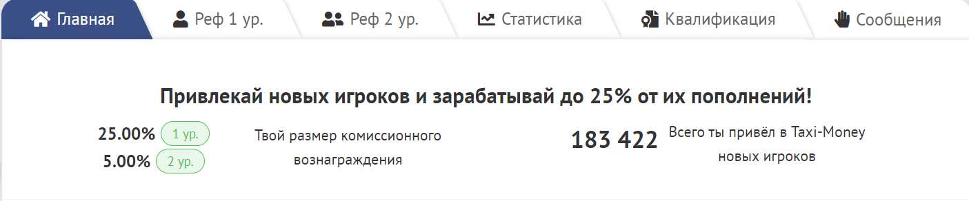 Вы будете получать до 20% от рефералов. Средства зачисляются равными суммами на пассажирский счет, счет вывода и жетоны. Таким образом, вы сможете зарабатывать вообще без вложений!