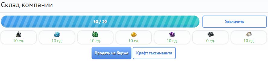 Вместимость склада компании ограничена. Возможны ситуации, когда склад Вашей компании будет полностью загружен добытой рудой. В таком случае новая руда, которую будут добывать сотрудники Вашей компании, не сможет быть отгружена на склад — она пропадёт.