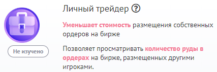 Бонус «Личный трейдер» позволяет Вам просматривать количество руды в ордерах на бирже, размещённых другими игроками. А также уменьшает стоимость размещения собственных ордеров на бирже.