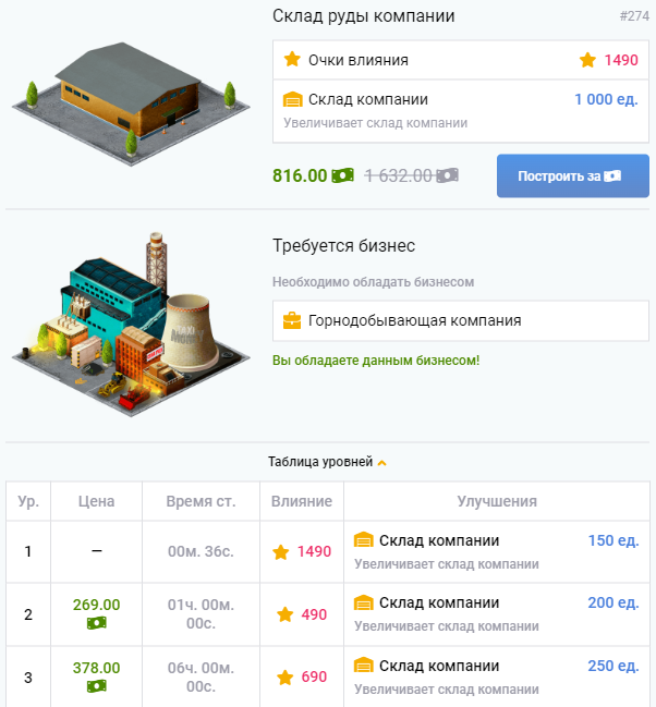 Последующее повышение уровня здания Вашей горной компании приведёт к снижению времени добычи руды всеми сотрудниками компании. Кроме того, улучшение этого здания также увеличит количество очков влияния в районе — а значит, приведёт к увеличению Вашего пассивного дохода от инвестиций в виртуальную недвижимость Taxi-Polis.