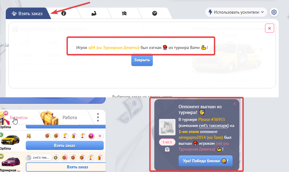 На этапе турнира, когда команды начинают зарабатывать очки для своей команды с помощью заказов, обладатель такси “Фантомас” может выбивать своих оппонентов из текущего этапа гонки, вместе со всеми заработанными очками.