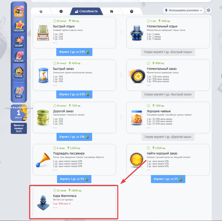 Каждое такси имеет способностей. Каждая способность имеет несколько уровней, чем выше уровень – тем сильнее эффект. Способности открываются при достижении определенного уровня такси или игрока. Способности можно изучить в гараже, на странице авто.