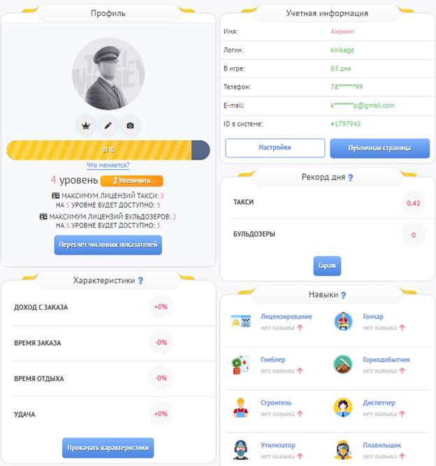 На этой странице Вы можете: кастомизировать аватар, посмотреть свой премиум статус, прокачать уровень и отслеживать прогресс опыта нажав кнопку «увеличить», при помощи таблеток опыта (можно приобрести там же). Ниже содержится информация о максимальном количестве лицензий и кнопка «пересчет числовых показателей» - нажмите ее, если некорректно отображается кол-во лицензий, сданных заказов и приглашений на работу.