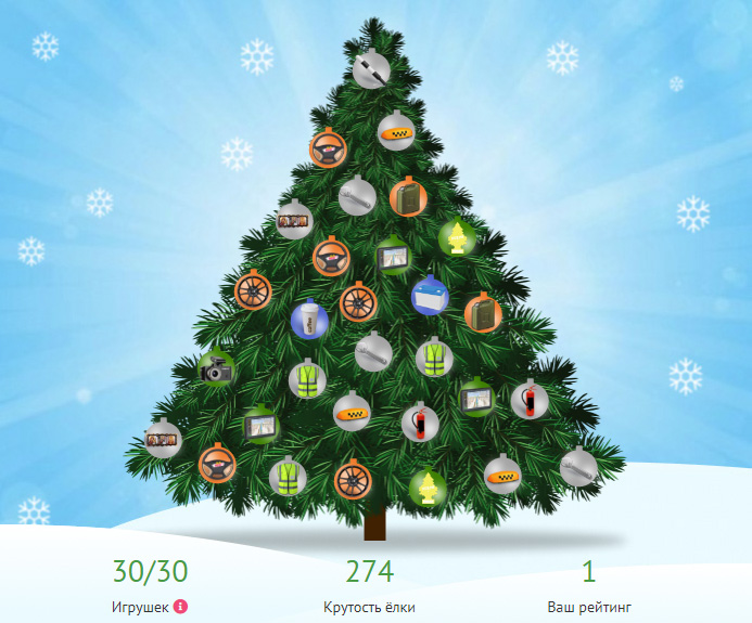 Призовой фонд конкурса составляет ровно половину от 202300 — 101 150 ! Украшай свою ёлочку новогодними игрушками. Каждая игрушка даёт твоей Taxi-ёлке победные очки.