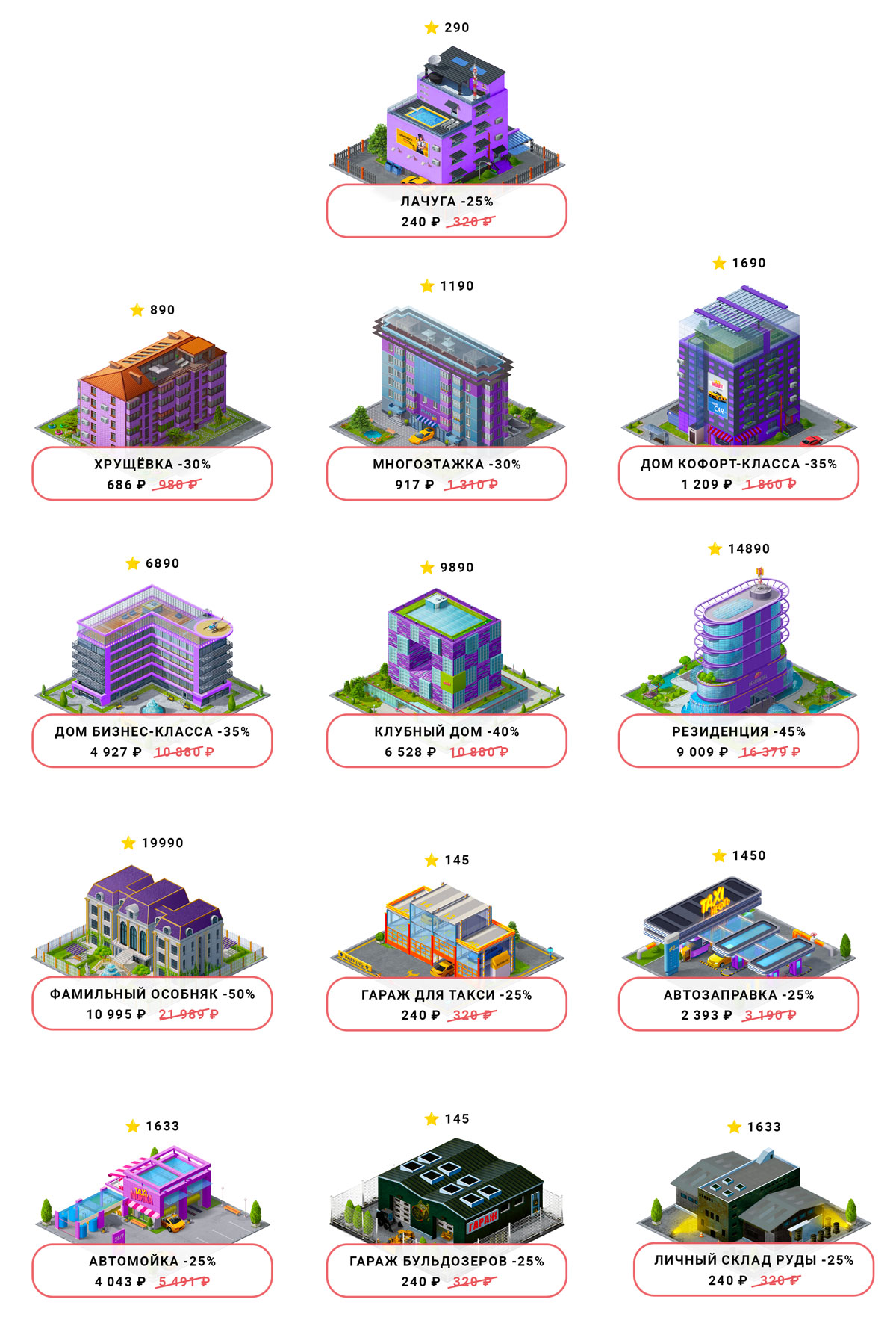 Построй автомойку, автозаправку, гараж для такси или для бульдозеров, личный склад руды, а также любое жилое здание со скидками до 10 885 !