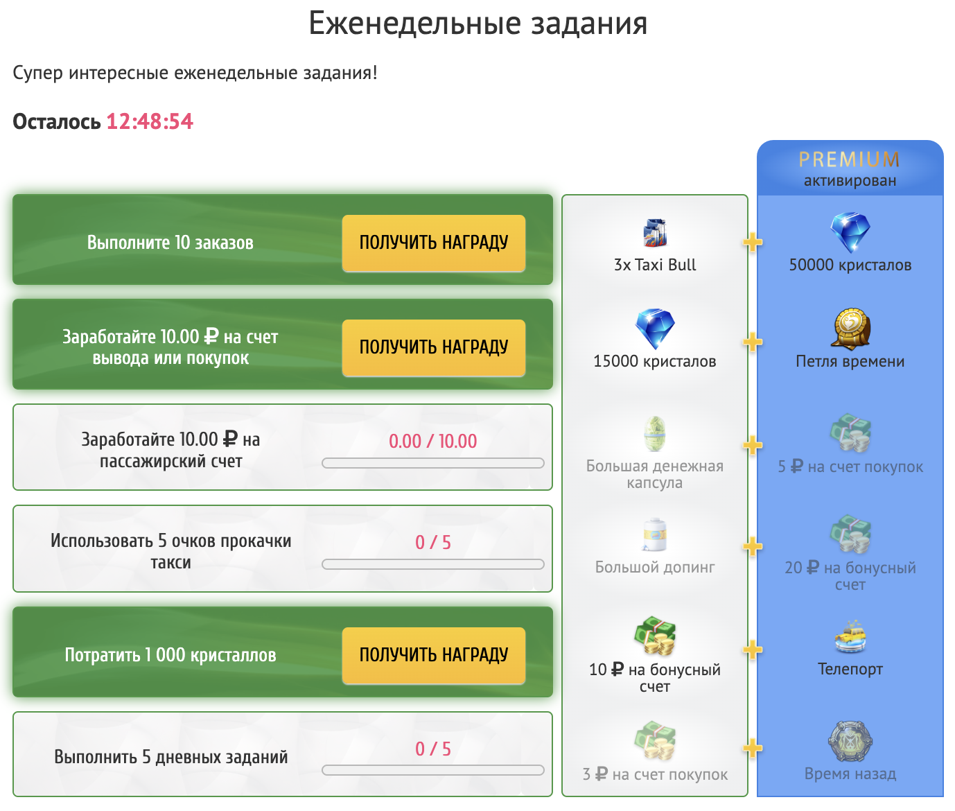 Обратите внимание — владельцы премиум-аккаунтов получают вдвое больше наград, и во многом это более интересные подарки! Приобретайте платиновую подписку, чтобы получить неоспоримые преимущества в Taxi-Money!