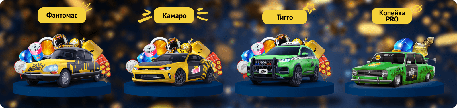 Проверь удачу в беспроигрышных лотереях праздничной акции! Ведь это возможность выиграть топовые такси для заработка — всего от 49 ! Выигрывай уникальные такси с крутыми бонусами: Фантомас 3-го ранга, Камаро 3-го ранга, Тигго 3-го ранга и Копейка PRO 1-го ранга!