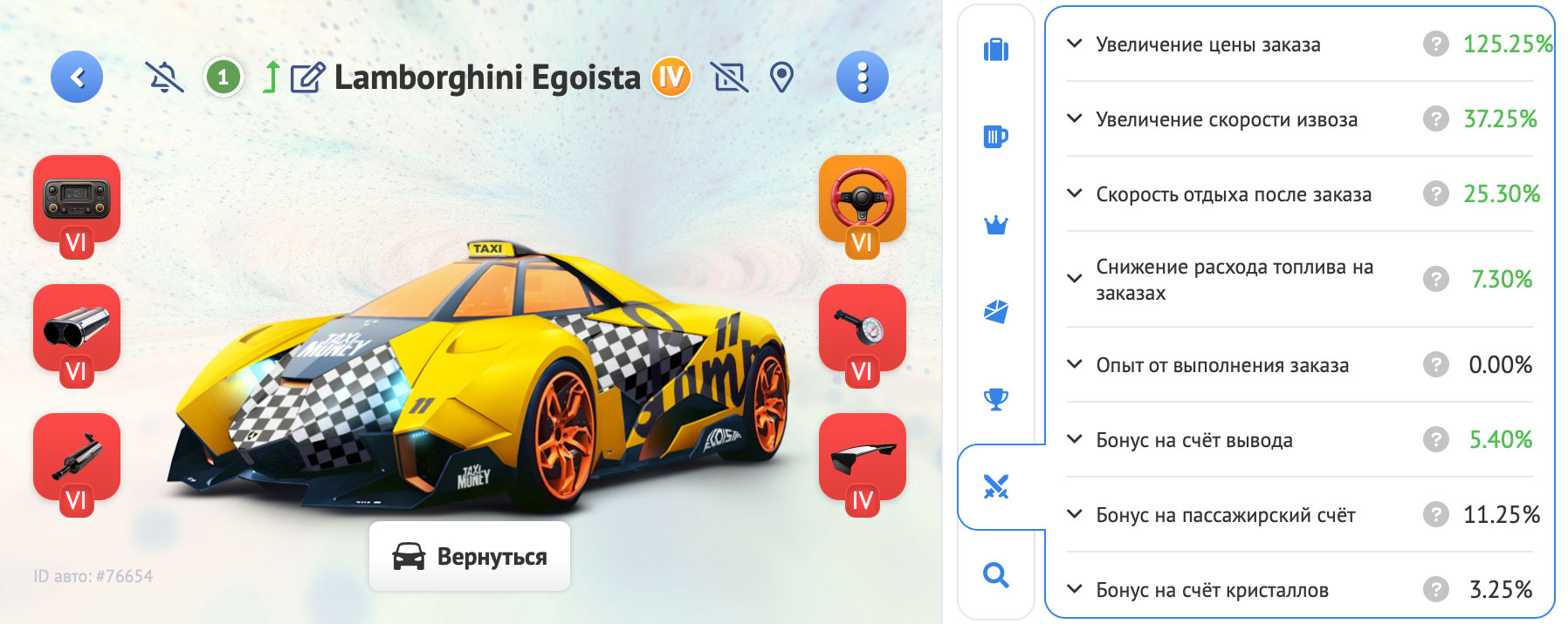 Moreover, you can customize the upgrades according to your choice - you can do it for contests, for tournaments, for crystals, for regular earnings, or for some combined earning strategy! And if necessary, items can be transferred from taxi to taxi. That is, you can change the upgrades for any other strategy!