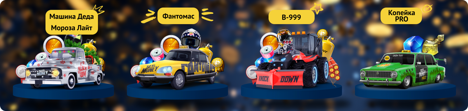 Помимо такси Машина Деда Мороза 2025, Машина Деда Мороза Лайт и бульдозера B-999 игра подарит тебе такси Копейка, бульдозеры A-100, B-100 или C-100 + кэшбек в подарок за пополнение Счёта покупок на соответствующие пороговые суммы: