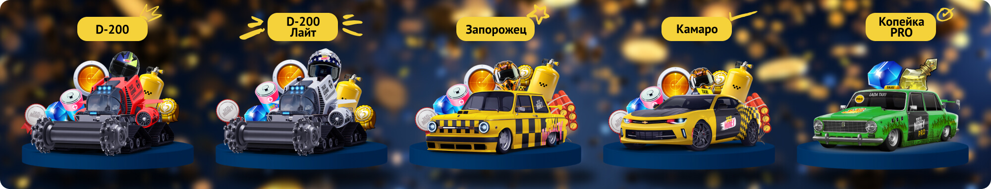 Помимо бульдозеров D-200, D-200 Лайт и такси Запорожец игра подарит тебе Копейку, Копейку PRO, Polo или Optima + кэшбек в подарок за депозиты на соответствующие суммы.